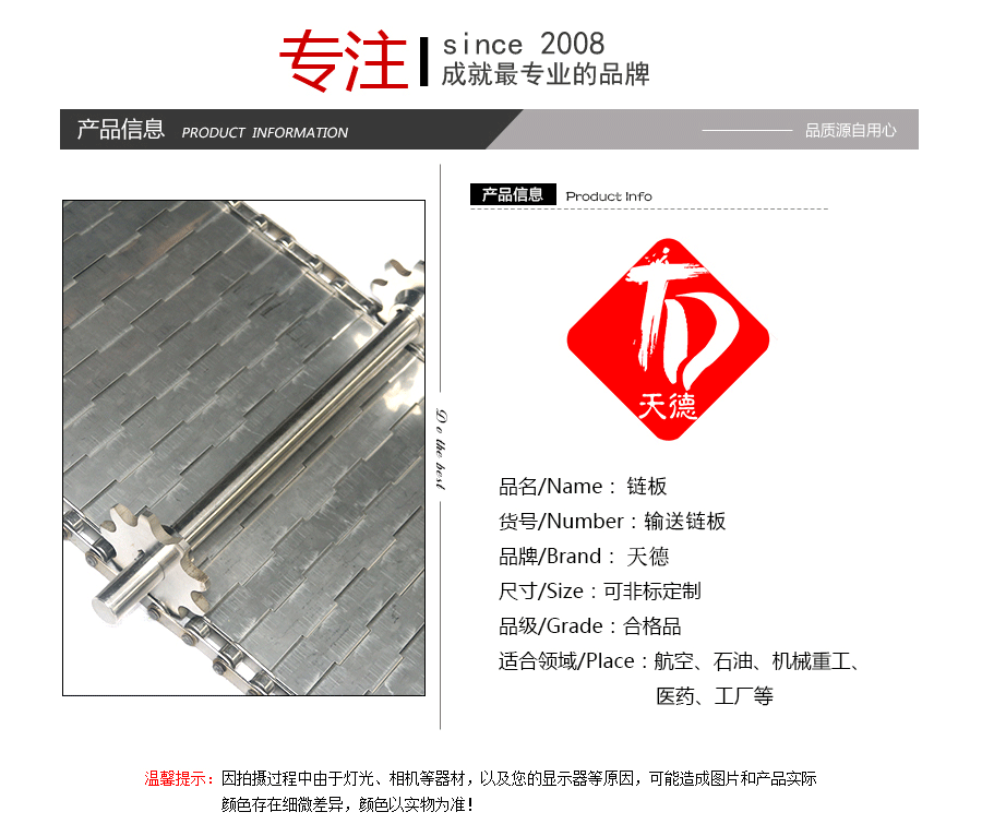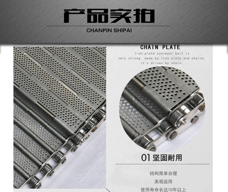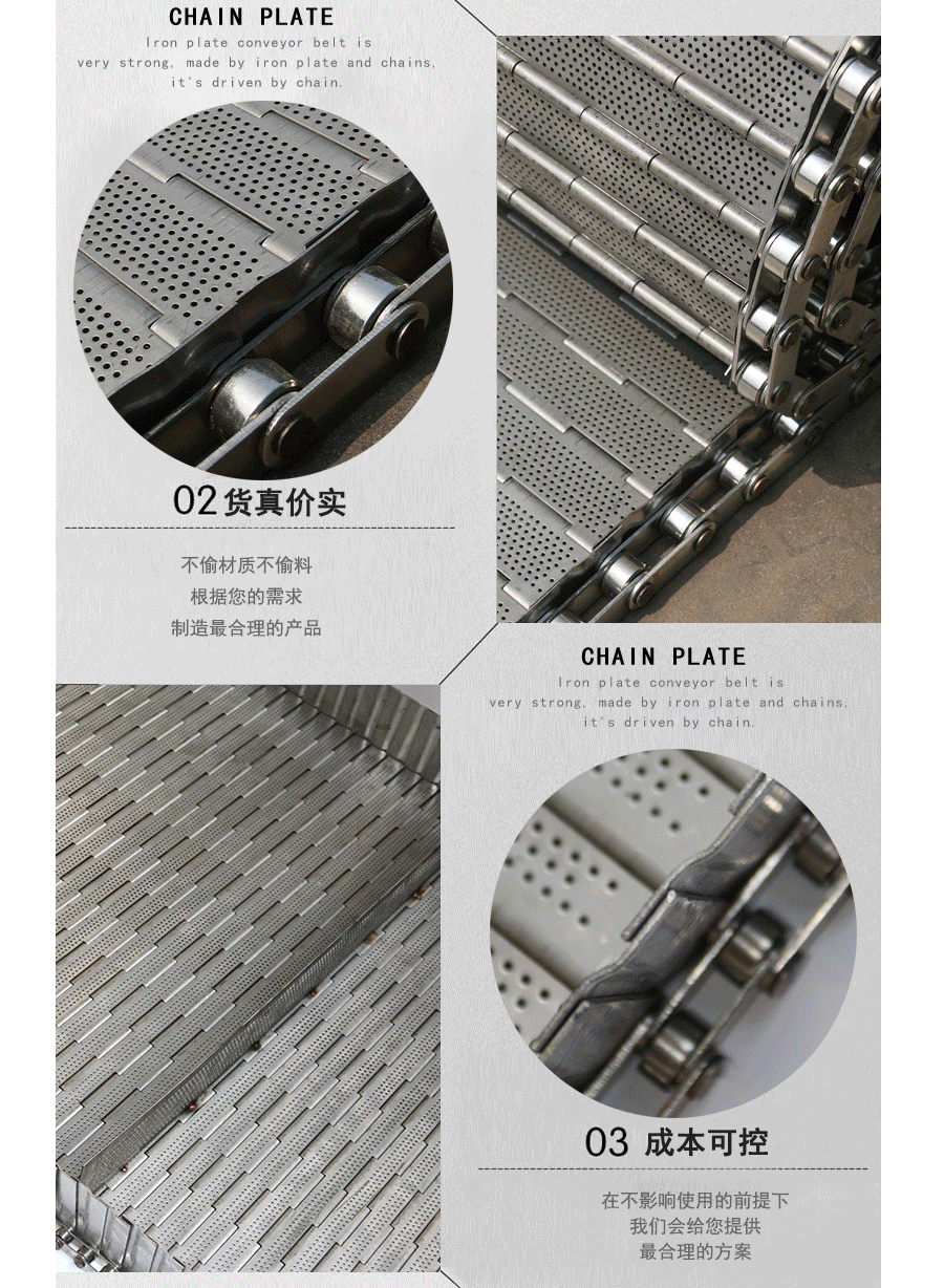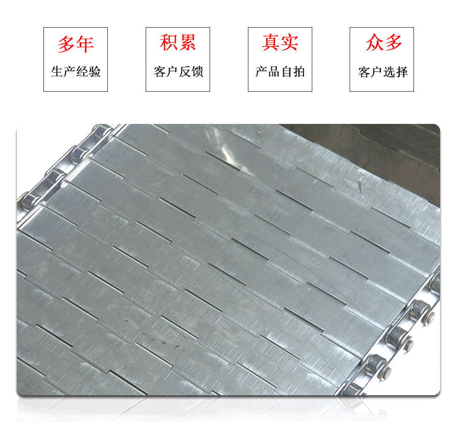 鏈板輸送帶:是采用不銹鋼板沖壓成型,鏈條傳動,每節(jié)由6-10mm支撐桿連接,其運動平穩(wěn)、力量大,適合用于輸送細小的高密度物件,輸送過程中運轉平穩(wěn),安裝更換方便,成本高,使用壽命較長。