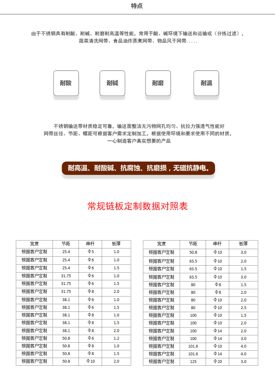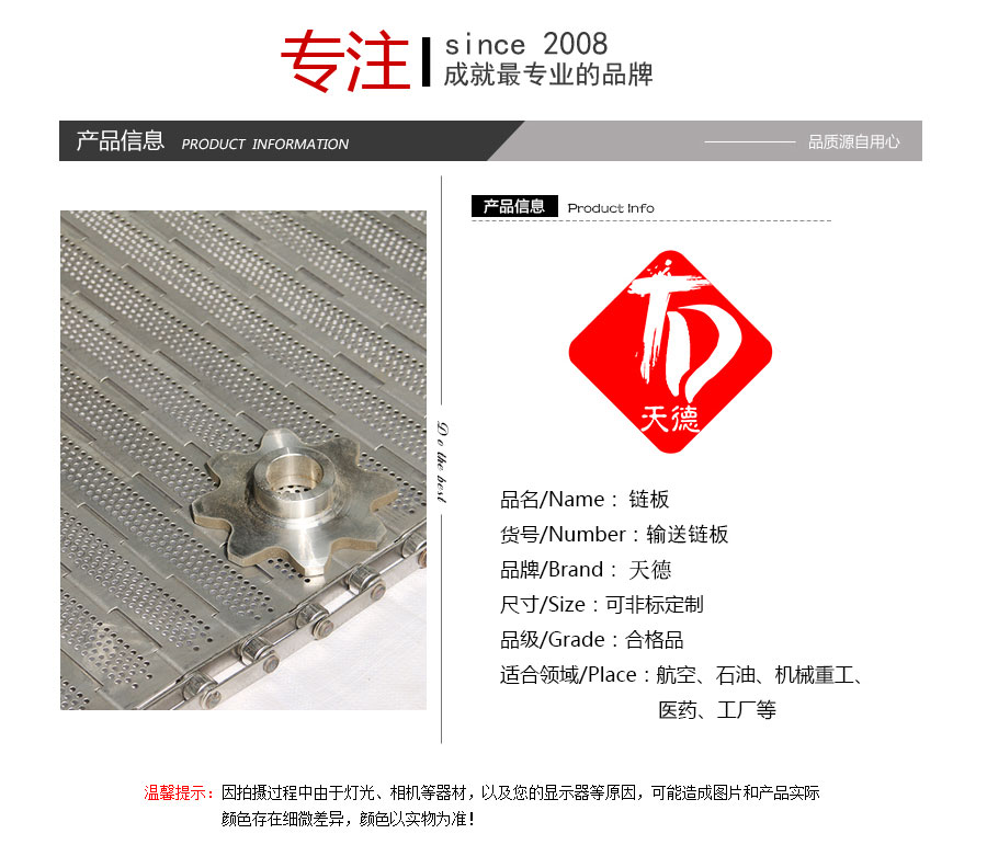 天德溫馨提示:輸送鏈板是定制產(chǎn)品,規(guī)格及報(bào)價(jià)會(huì)根據(jù)板厚、節(jié)距、串桿直徑、材質(zhì)、寬度、長(zhǎng)度來計(jì)算,親 也可以告訴我們使用要求、應(yīng)用環(huán)境、每米載重量,由我們來幫您推薦定制數(shù)據(jù),盡力做到定制的產(chǎn)品即夠用也不浪費(fèi)。